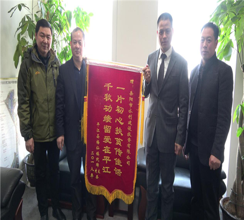 1月22日,平江縣梅仙鎮(zhèn)玳璋村幫扶對(duì)象,將一面寫(xiě)著"一片初心扶貧傳佳話,千秋功績(jī)留愛(ài)在平江"18個(gè)大字的鮮紅錦旗送到市水建投董事長(zhǎng)劉寶山、總經(jīng)理?xiàng)钚圯x的手中,對(duì)市水建投對(duì)精準(zhǔn)扶貧工作的大力支持表達(dá)誠(chéng)摯謝意。