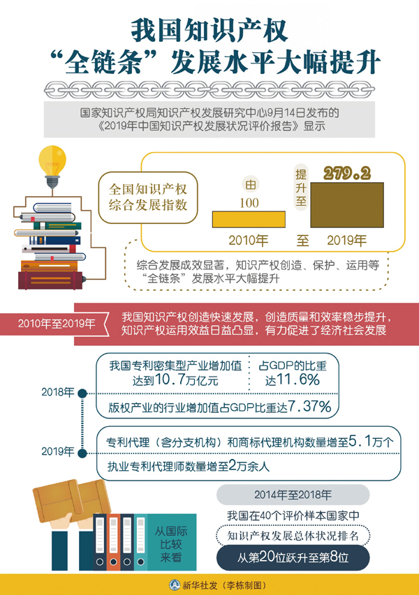 ——在完善法律法規(guī)方面,基本建立起符合國際通行規(guī)則、門類較為齊全的知識產(chǎn)權(quán)法律制度,實(shí)現(xiàn)了專利、商標(biāo)、地理標(biāo)志等知識產(chǎn)權(quán)的全方位、立體化保護(hù)。加入世貿(mào)組織以來,中國先后多次修訂專利法、商標(biāo)法和著作權(quán)法等法律,基本形成了知識產(chǎn)權(quán)“嚴(yán)保護(hù)”的法律制度體系。